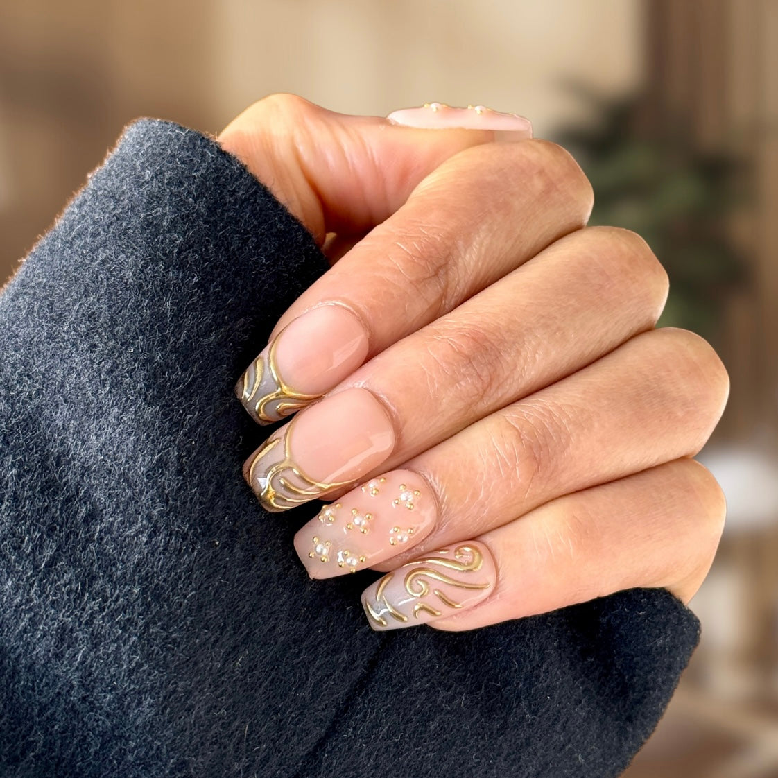 Description: Raise a glass with Golden Toast, the ultimate holiday-ready nail set. Glimmering gold with soft pearl accents, these nails are all about celebration, sparkle, and good vibes. Perfect for toasting to the season, ringing in the new year, or just adding a touch of luxe to your look.