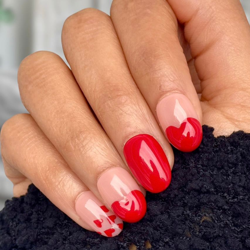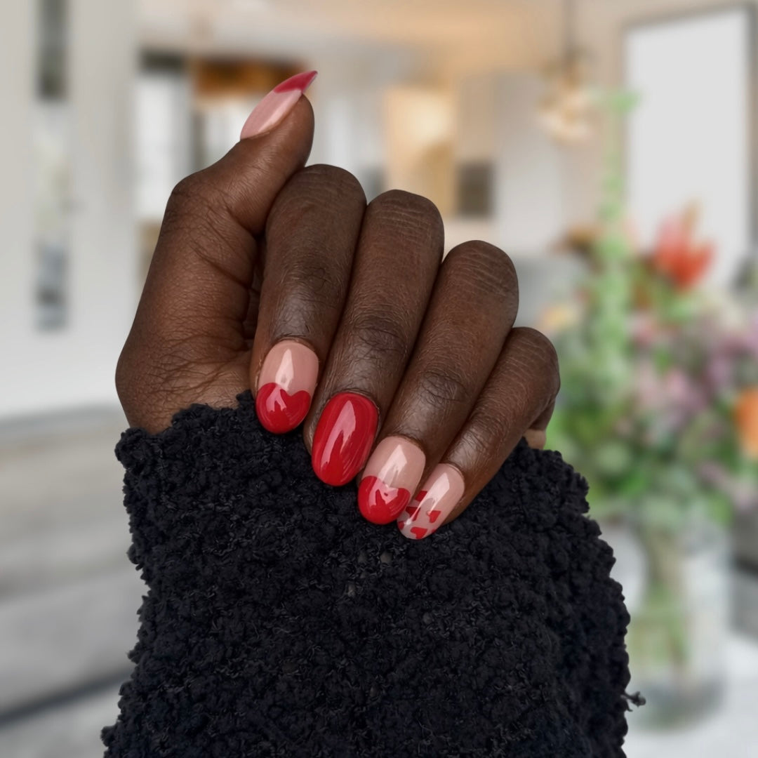 The Love Letter press-on nail set blends glossy red with a soft nude base and delicate heart accents for a timeless romantic look. Featuring a flattering medium almond shape, this design combines bold statement nails with subtle heart detailing for the perfect balance of sweet and confident.