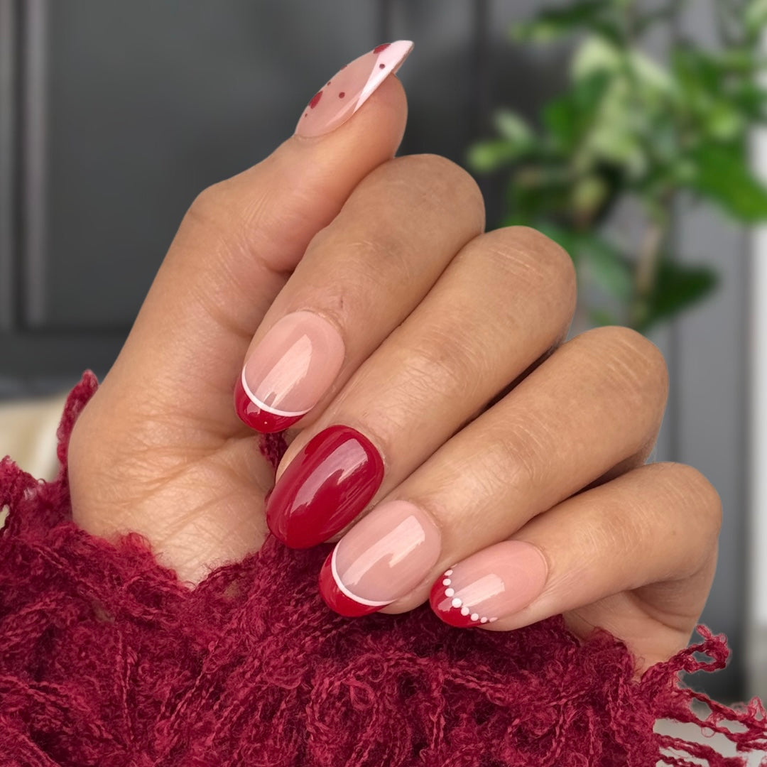 This glossy red and soft nude manicure features a modern French tip design with delicate pearl dot details and a bold cherry red accent nail. The result? A timeless yet playful Valentine-inspired look that feels effortlessly chic.