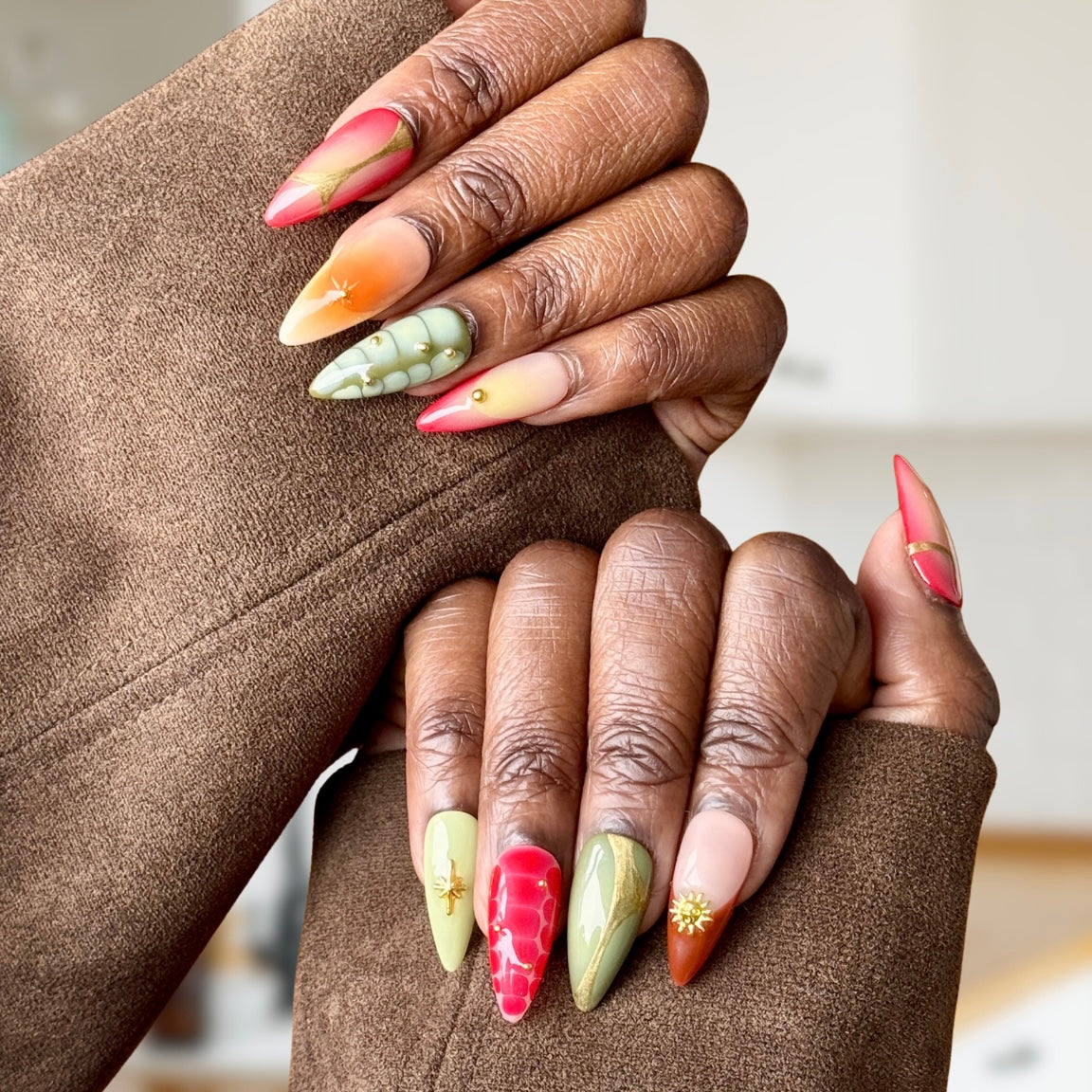 Description: This dazzling assortment features vibrant shades of lush green, bold red, and shimmering gold, all infused with sparkling accents that evoke the magical glow of sunset.