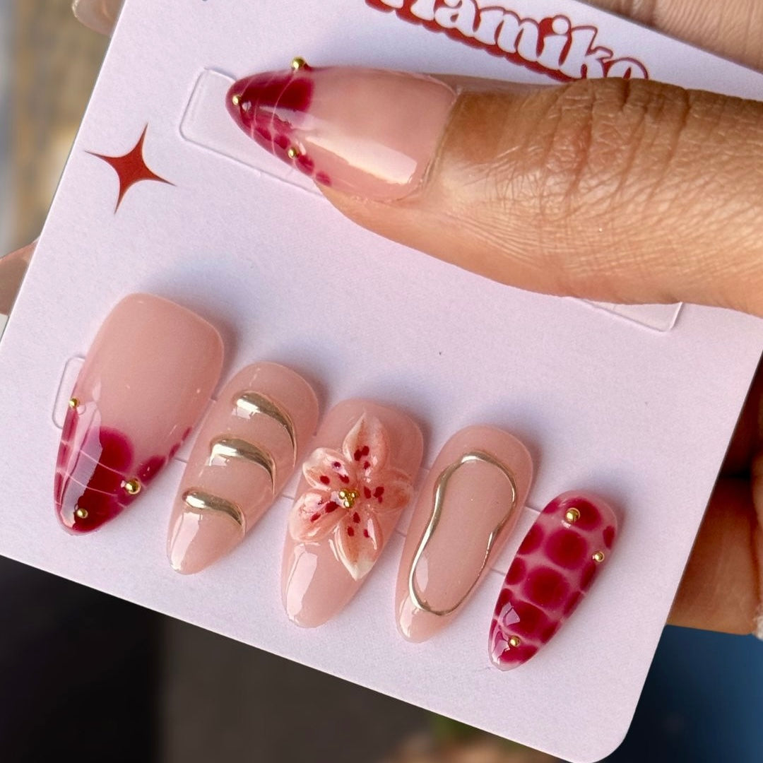 Description: Unveil the artistry of nature with Luxe Flora. This set combines the grace of nude tones with radiant gold accents, crowned by a striking 3D blossom and a bold crimson crocodile detail.